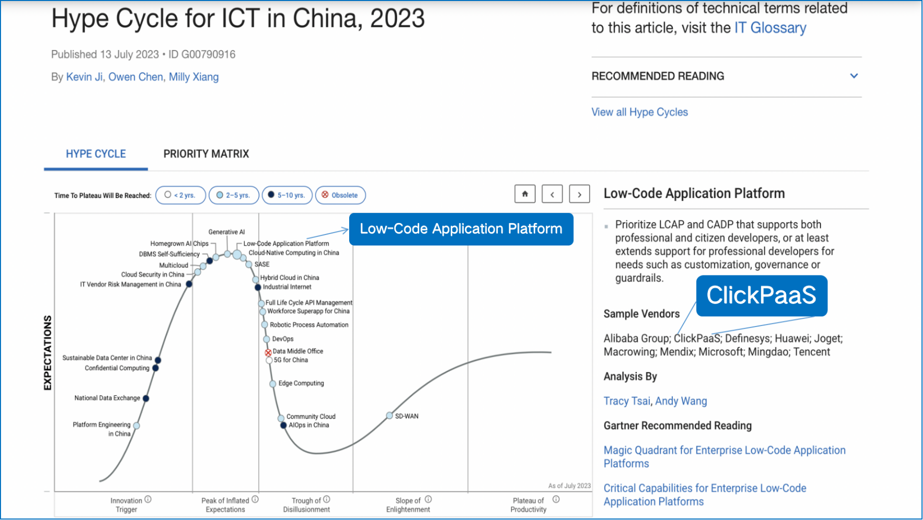 近日,国际权威研究机构Gartner发布了《Hype Cyple for ICT in China,2023(2023年中国ICT技术成熟度曲线)》报告,pg电游站凭借平台的aPaaS+iPaaS+DaaS保障业务系统的一站式设计,多租户、热发布、国际化、信创安全等特性实力登榜,并作为低代码PaaS平台代表厂商TOP2入选本次报告。